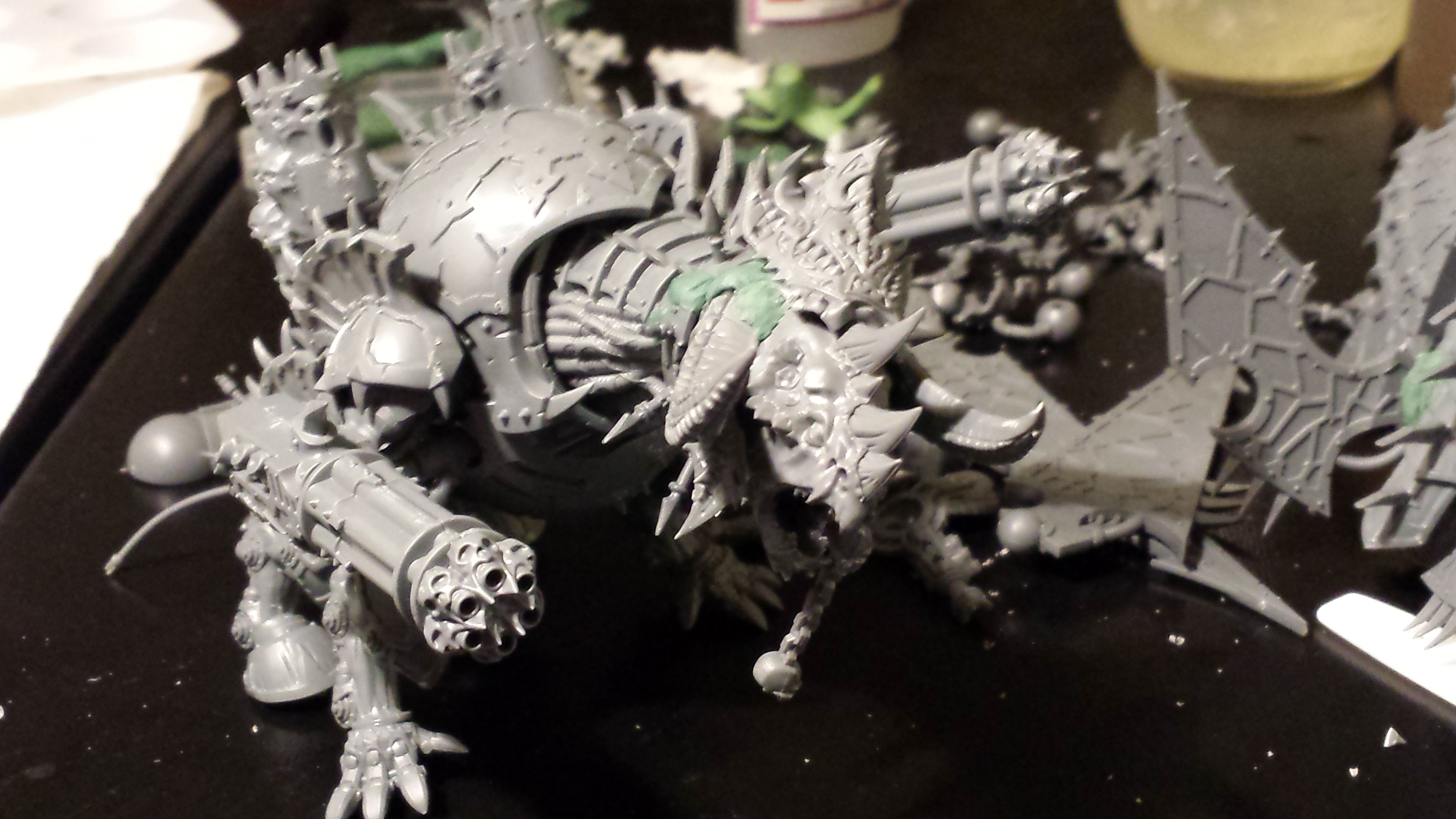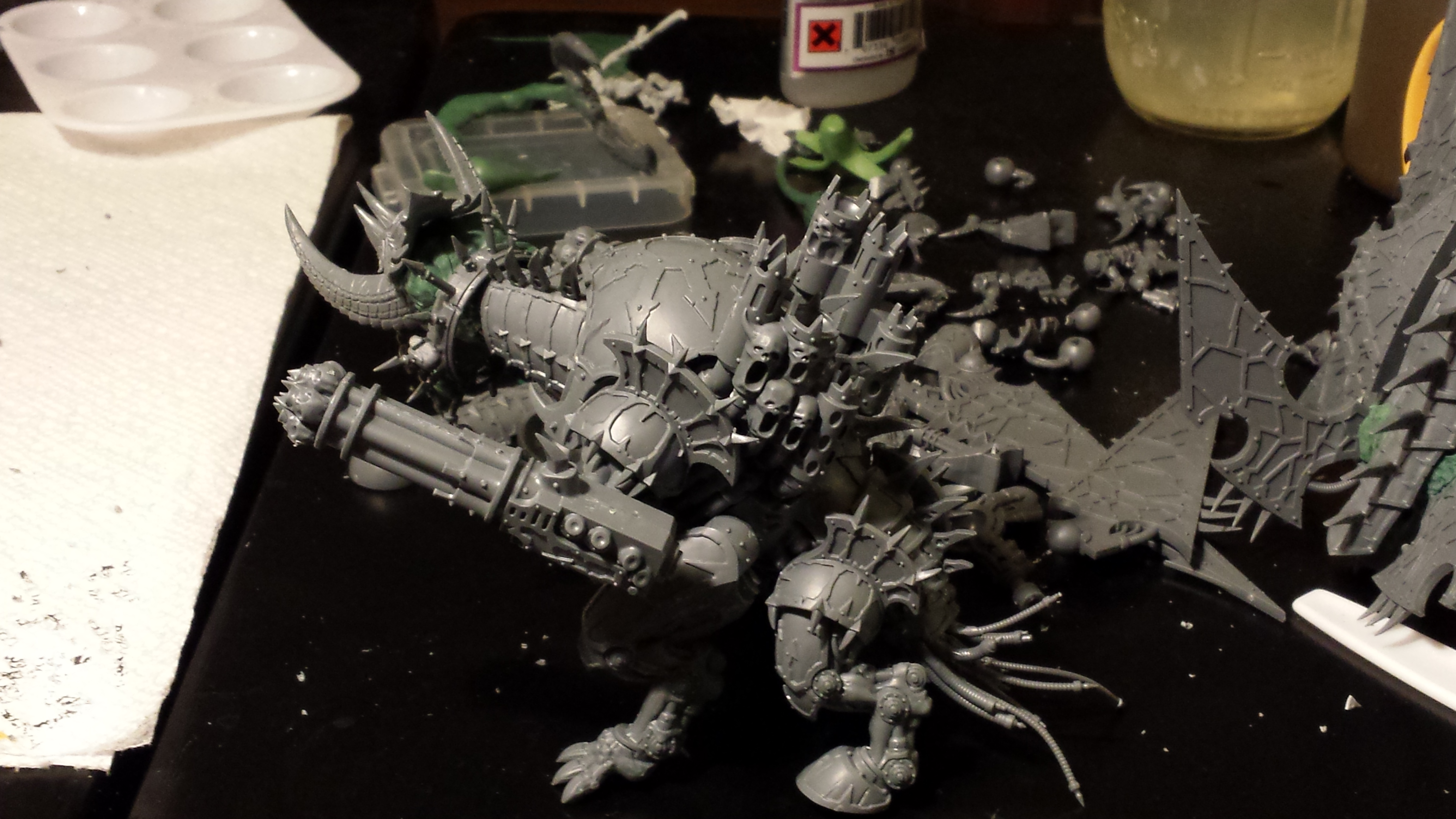 As I mentioned, the rest of the model is pretty standard. I clipped all of the small tendrils off of the Heldrake and stuck them in a tiny greenstuff plug that, ideally, hoists them at an angle where they won’t risk snapping off. Probably paint them with an orange-red glow to show latent energy trailing the beast. There’s also a patch of empty space on the top of the Forgefiend’s “hump” that I’d like to find something to adorn, but nothing’s come to mind yet. I also recognize that I should probably try painting what’s here before I add more fiddly bits to crawl around.