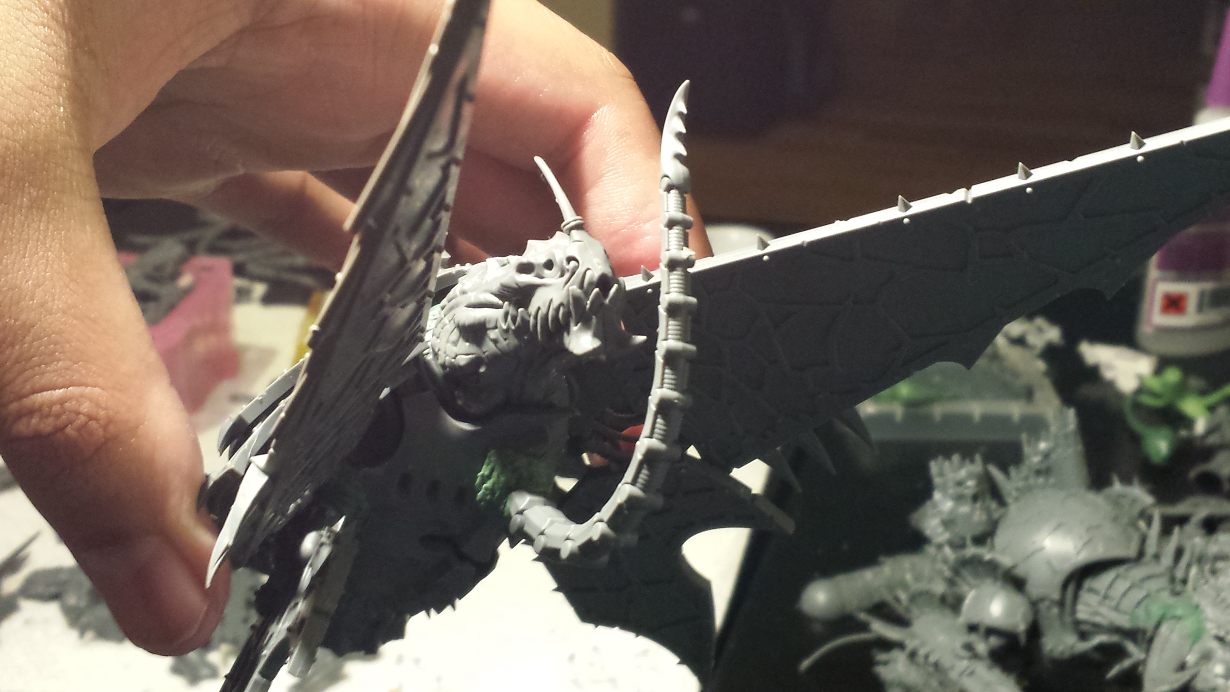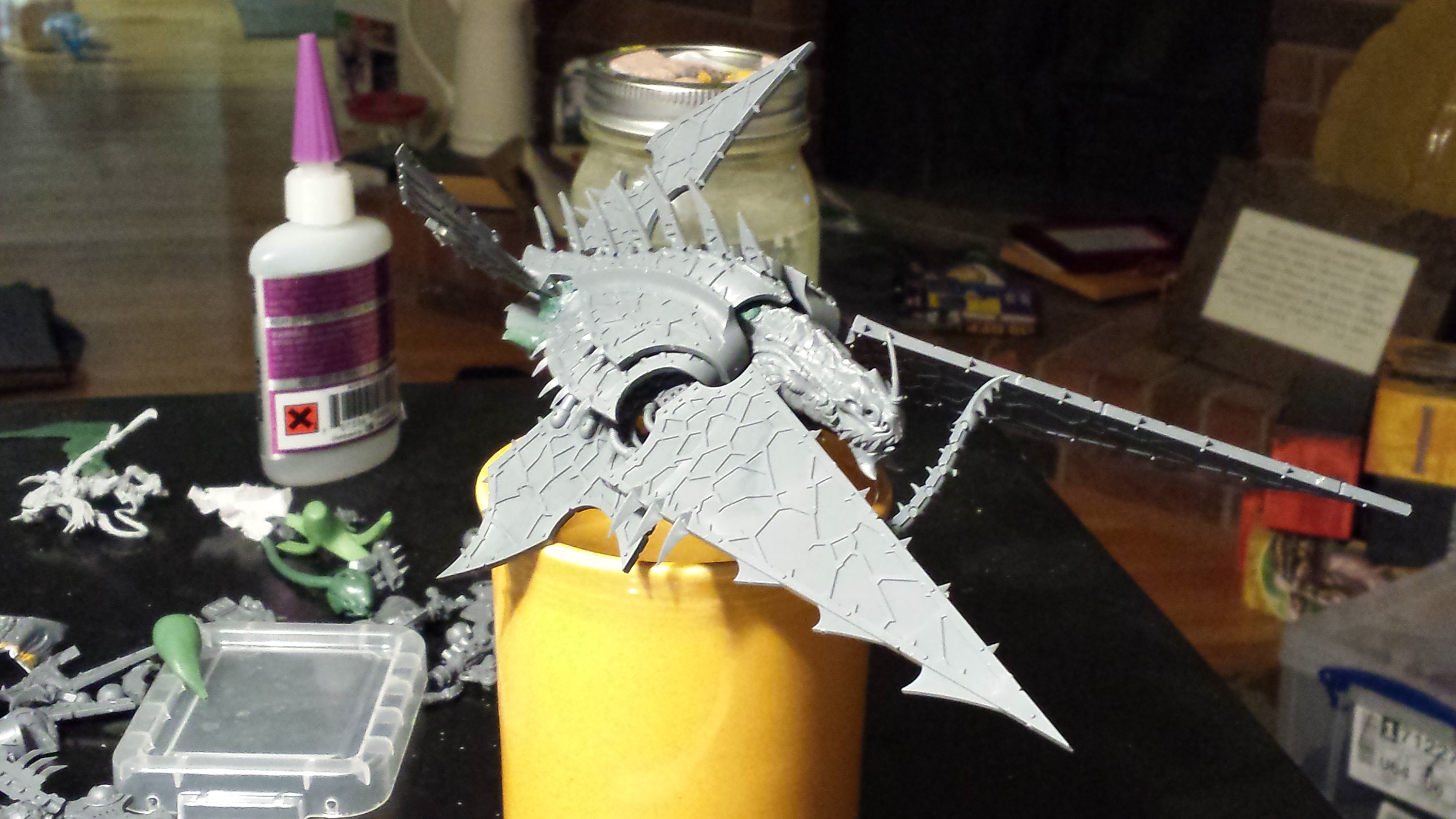 For my Heldrake, I took the conversion that made sense and added some tweaks. Following the conversion was much more challenging than I thought it would be, especially positioning the two big wings. It didn’t help that the bottom of the Heldrake is SPIKEY (surprise, surprise) and a previous glue-related incident meant that the pad of my workin’ thumb was missing a considerably amount of epidermis directly underneath both the weight of the model and several pointy bits. Still, compared to the couple ounces of blood that worked their way into my kroot/space marines I consider the pain a marginal sacrifice.