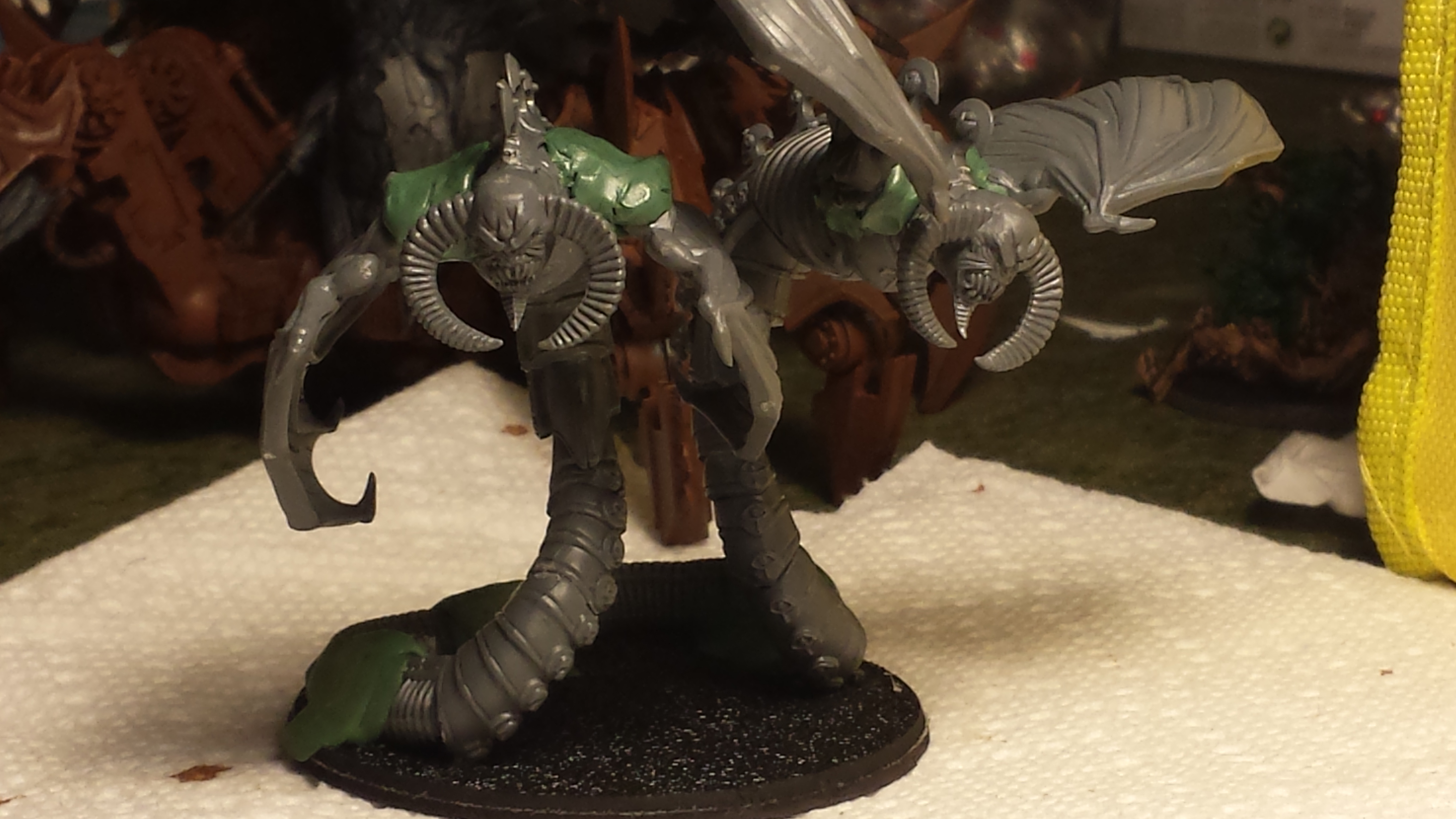 “Finished” is always relative for me; there are tweaks I’d like to do, I’d love to get his skin tone back up to the rich Av Sunset he was before I washed him (as would my wife, who offered to commission me painting one up looking like that after she saw how the wash wrecked his skin). I had the same problem with my Carnosaur, but I think it’s definitely taught me to exercise greater care with my washes. I am proud of this figure, though, for the early greenstuff work and the little flourishes with his wings.
