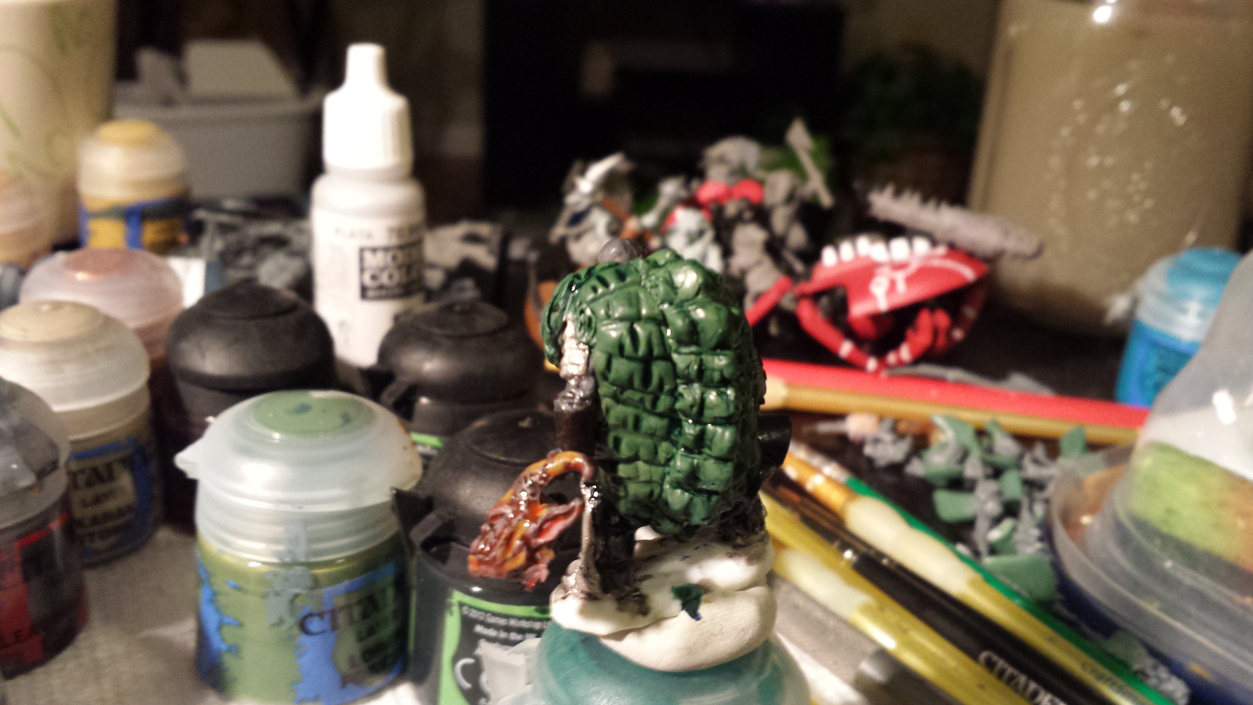 I also gave him an alligator-skin cloak (that part actually came first). The base model for all of this was a Reaper Bones, as was Darif, and my current 5e character is a very simple mod of Vaeloth the Paladin—all I did with him was hack off the shield and shape the arm into something cestus-like. Reaper minis are great for character models because they’re already evocative, and take alteration pretty easily; you can cut them without worrying they’ll shatter or splinter, and since they aren’t metal there’s not that same bending issue. I think that’ll continue with the second wave, though I’ve noticed the weapons are far more prone to bending out of the box; to the point where my wife commented on it when I was showing off my spoils.